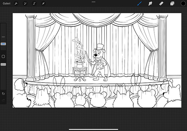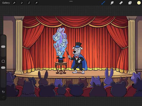 The original was lacking an audience, so we asked Muh to add one to the scene. Also, make the rabbit out of the hat aspect more chaotic looking to add an extra sense of fun.